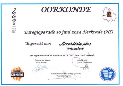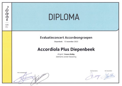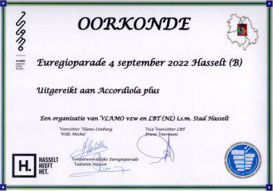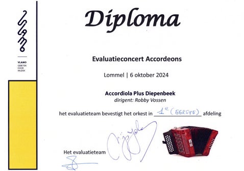 Op 6 oktober 2024 heeft Accordiola plus deelgenomen aan het evaluatieconcert georganiseerd door "VLAMO" i.s.m. Accordeonclub "Frizzante" . Als juryleden: Docent Johan Nijs componist arrangeur gastdirigent Belgische componist Kon. muziekconcevatorium Brussel en Docent Sander Jadubka Accordeon, HAFA Directie Campus Lemmens Kunstacademie Noord Limburg . We mogen met trots weergeven dat onze accordeonclub "accordiola plus" een evaluatie heeft gekregen in 1e (eerste) afdeling.